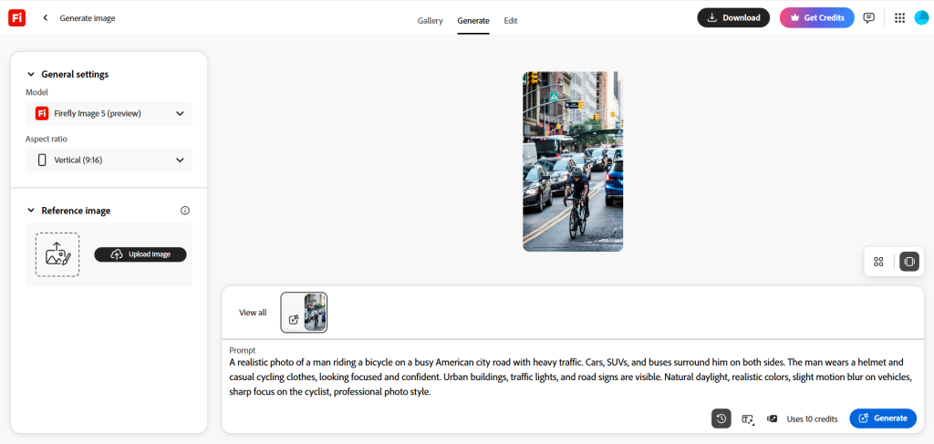 After clicking the Generate button, I received a realistic image created by Adobe Photoshop Firefly AI. The image clearly shows a man riding a bicycle on a busy American city road.