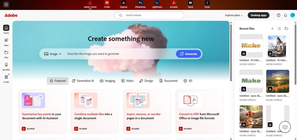 The top menu shows tools like Firefly, Express, Photoshop, Lightroom, Acrobat, Stock, and Fonts. These options help users move to other Adobe tools from the same screen.