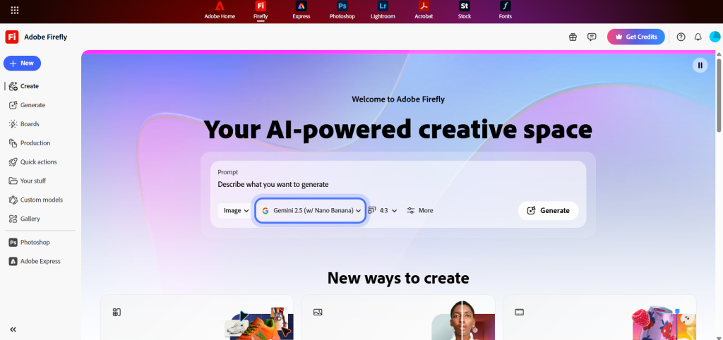 At the bottom, I can see “New ways to create” with example images. These give me ideas about what I can make. The dashboard also has links to Photoshop and Adobe Express. Everything is organized nicely.