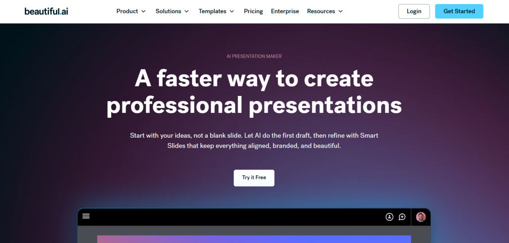 Beautiful.ai is great if you want slides that wow people. It’s like having a designer friend.