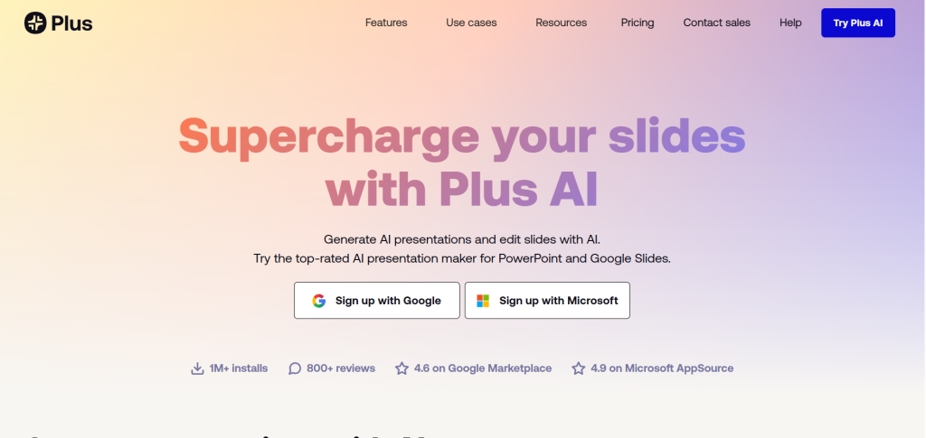 Plus AI is perfect if you use Google Slides. It fits right into your work. This tool makes slides from your notes or ideas.