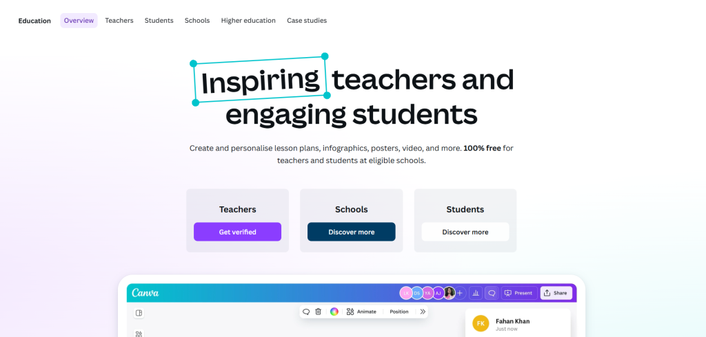 Canva is a design tool with AI. For education, it is free for teachers. It helps make posters, slides, or videos.