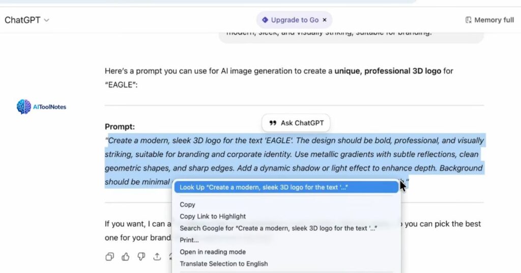 The first thing I did was open ChatGPT and use a specific prompt template designed for logo creation. The template is simple to use — you just swap out a placeholder word (in the original example it’s “eagle”) with whatever concept, animal, object, or symbol you want at the center of your logo.